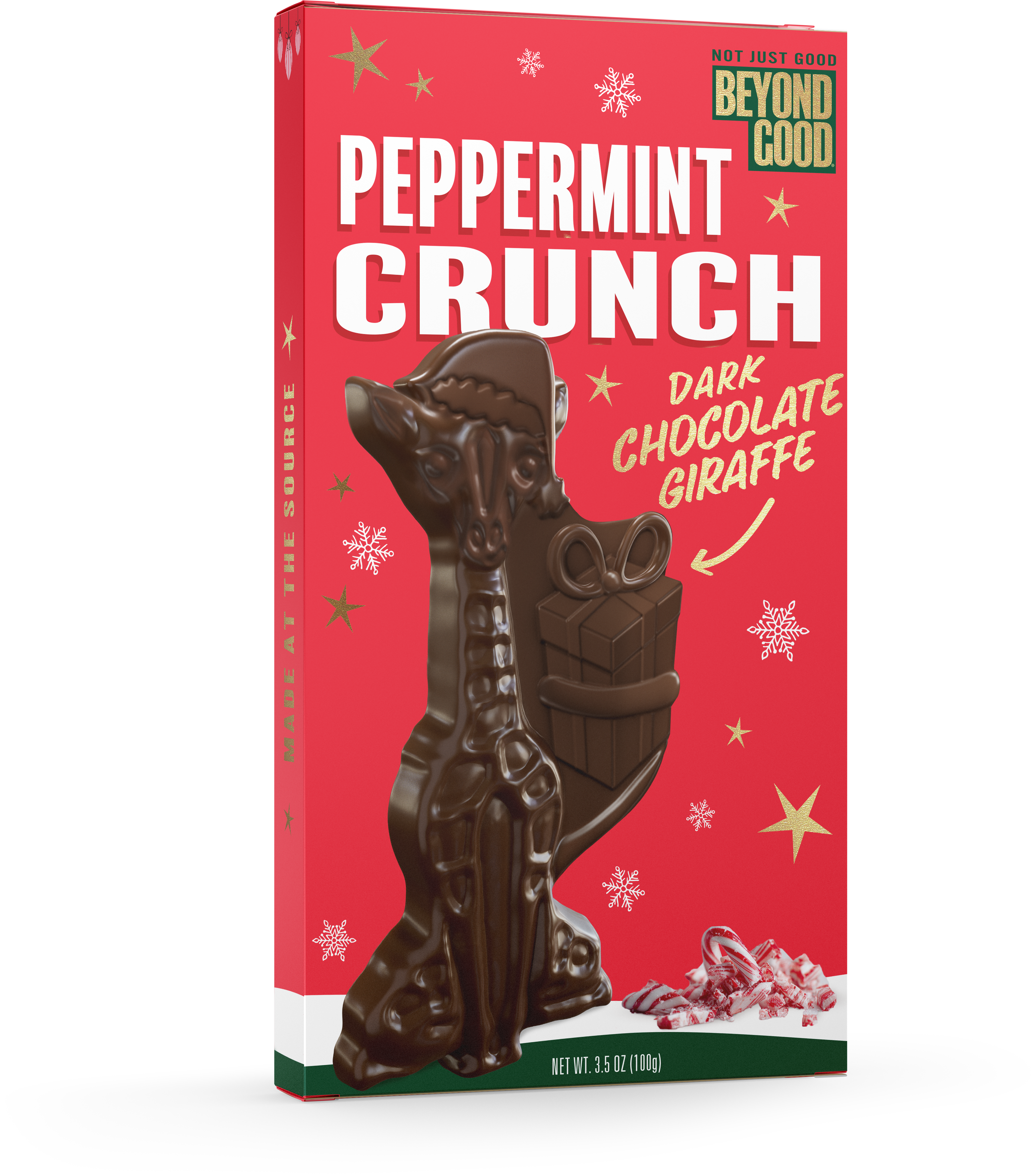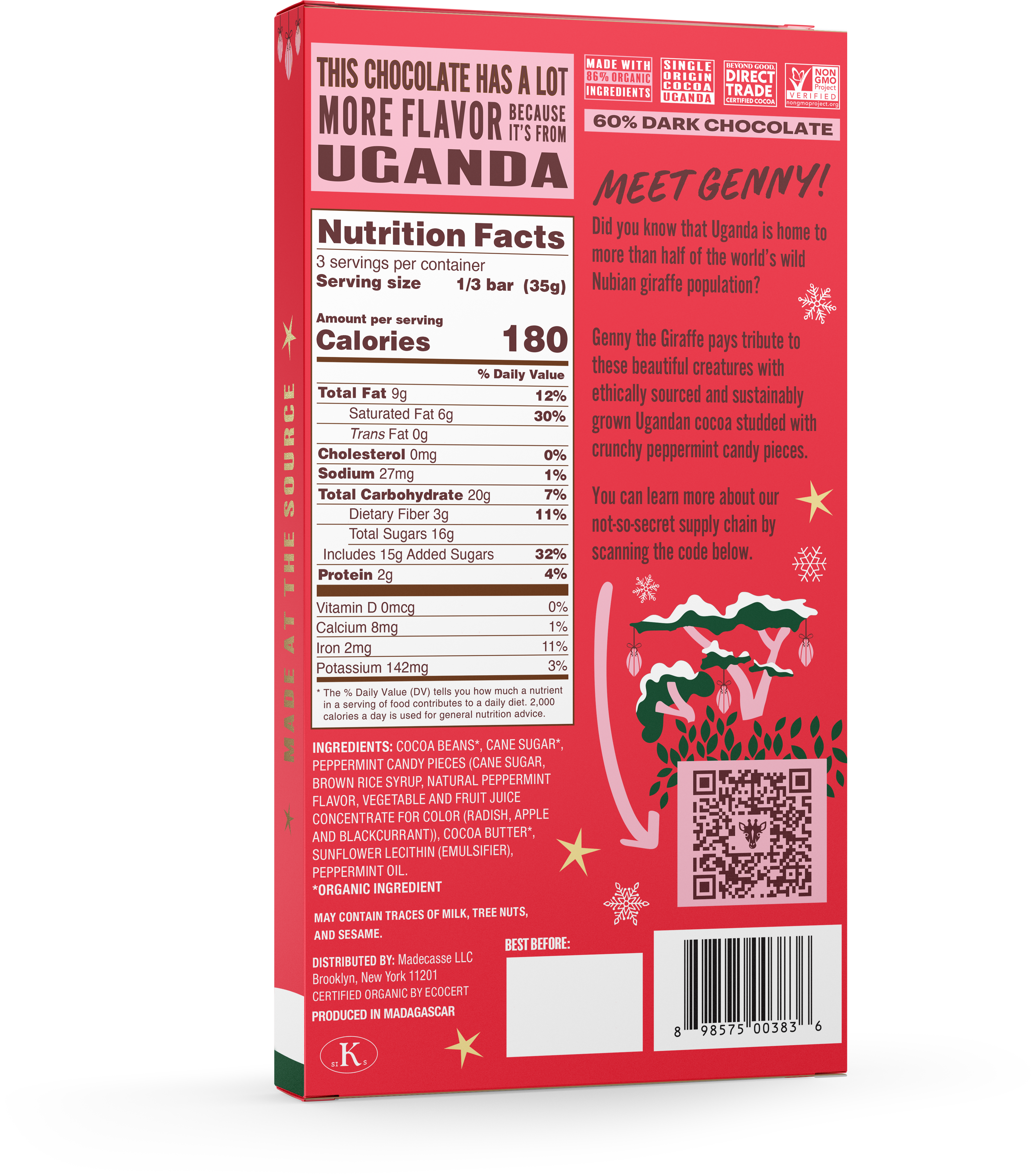 Meet Genny! Did you know that Uganda is home to more than half of the world’s wild Nubian giraffe population? Genny the Giraffe pays tribute to these beautiful creatures with ethically sourced and sustainably grown Ugandan cocoa studded with crunchy peppermint candy pieces. • 60% Cocoa Dark Chocolate • Single Origin & Direct Trade Cocoa from Uganda • Made with 86% Organic Ingredients • Non-GMO Project Verified
